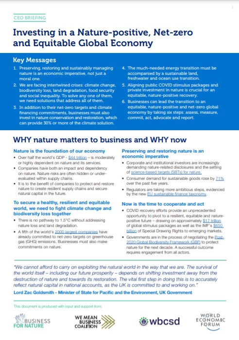 This CEO briefing launched by Business for Nature, We Mean Business Coalition, WBCSD and the World Economic Forum outlines how businesses can break the siloes, and how they can lead the transition to a nature-positive, net-zero and equitable future