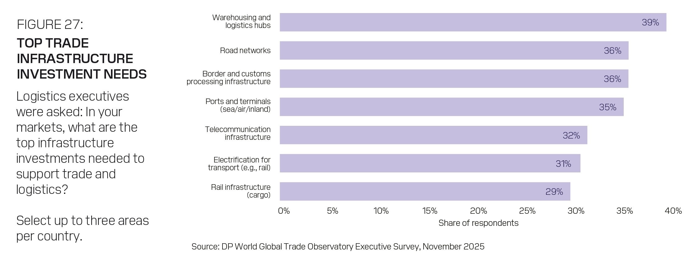 One clear answer emerged when logistics executives were asked to name the top three infrastructure investments needed to support trade and logistics in their markets. “Warehousing and logistics hubs” was the top choice, selected by 39% of respondents.