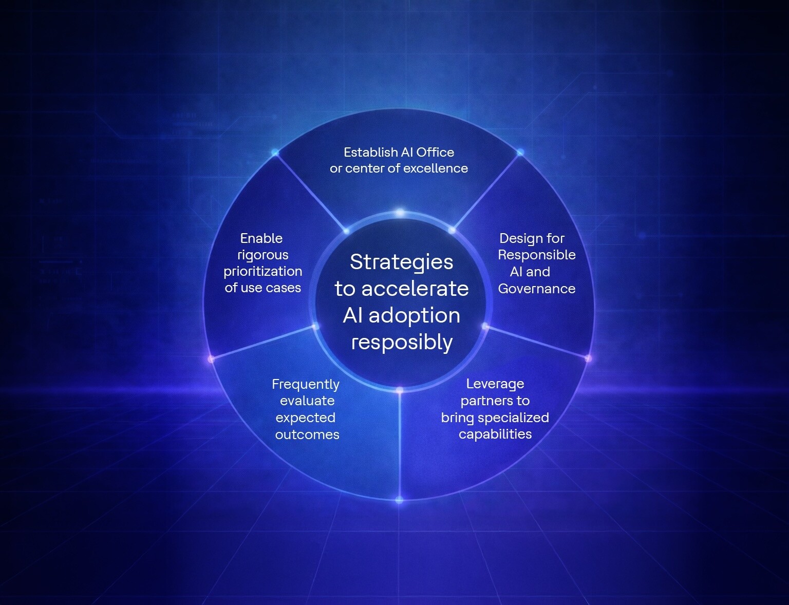 Accelerating AI adoption and improving time to value requires strong coordination, rigorous prioritization, partnerships, frequent evaluation and responsible AI by design practices. To enable this, leading organizations often adopt these five strategies:
