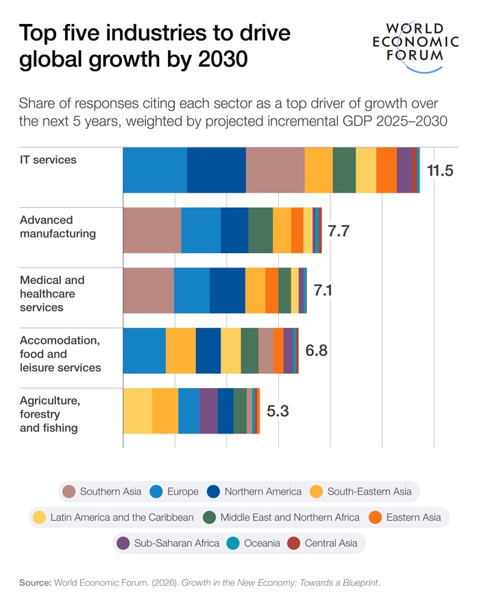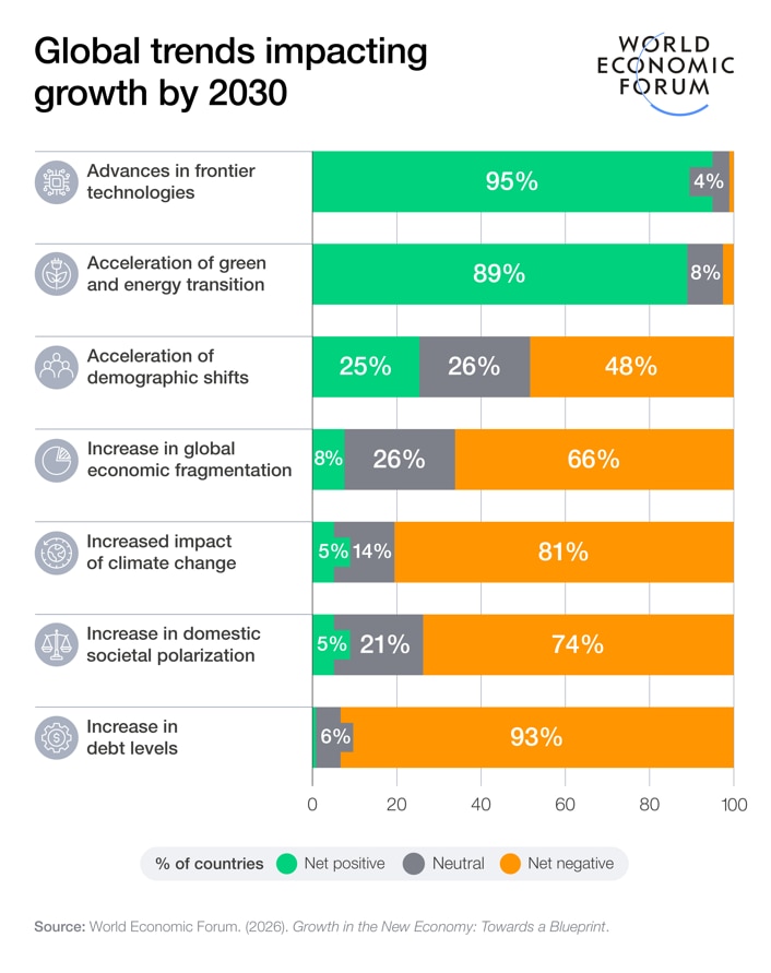 - AI adoption, geostrategic competition, rising debt, and environmental and demographic challenges are poised to shape the new economy, and demand new growth strategies.