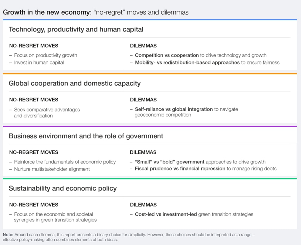 So what should leaders actually do in the face of so much uncertainty? The report identifies "no-regret" moves and open dilemmas that will define four major areas of economic policy in the coming decade: